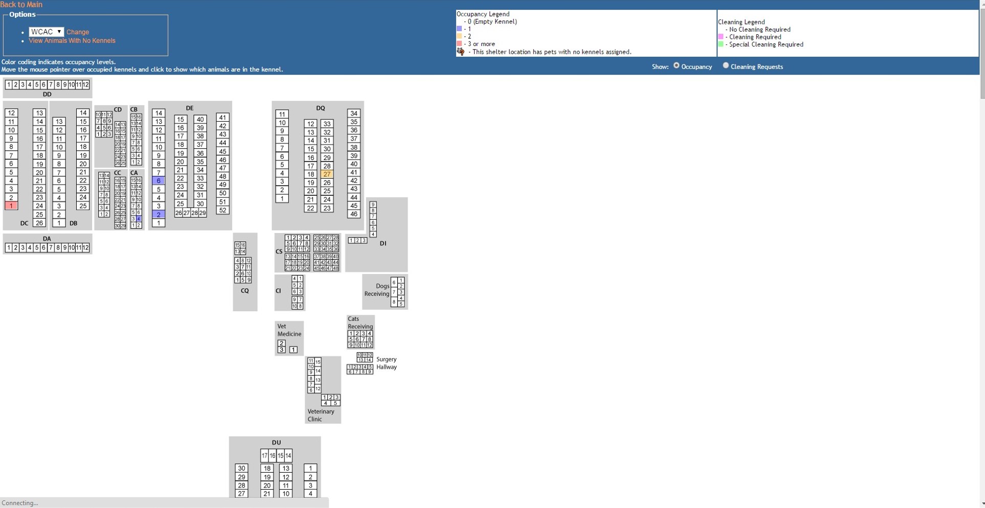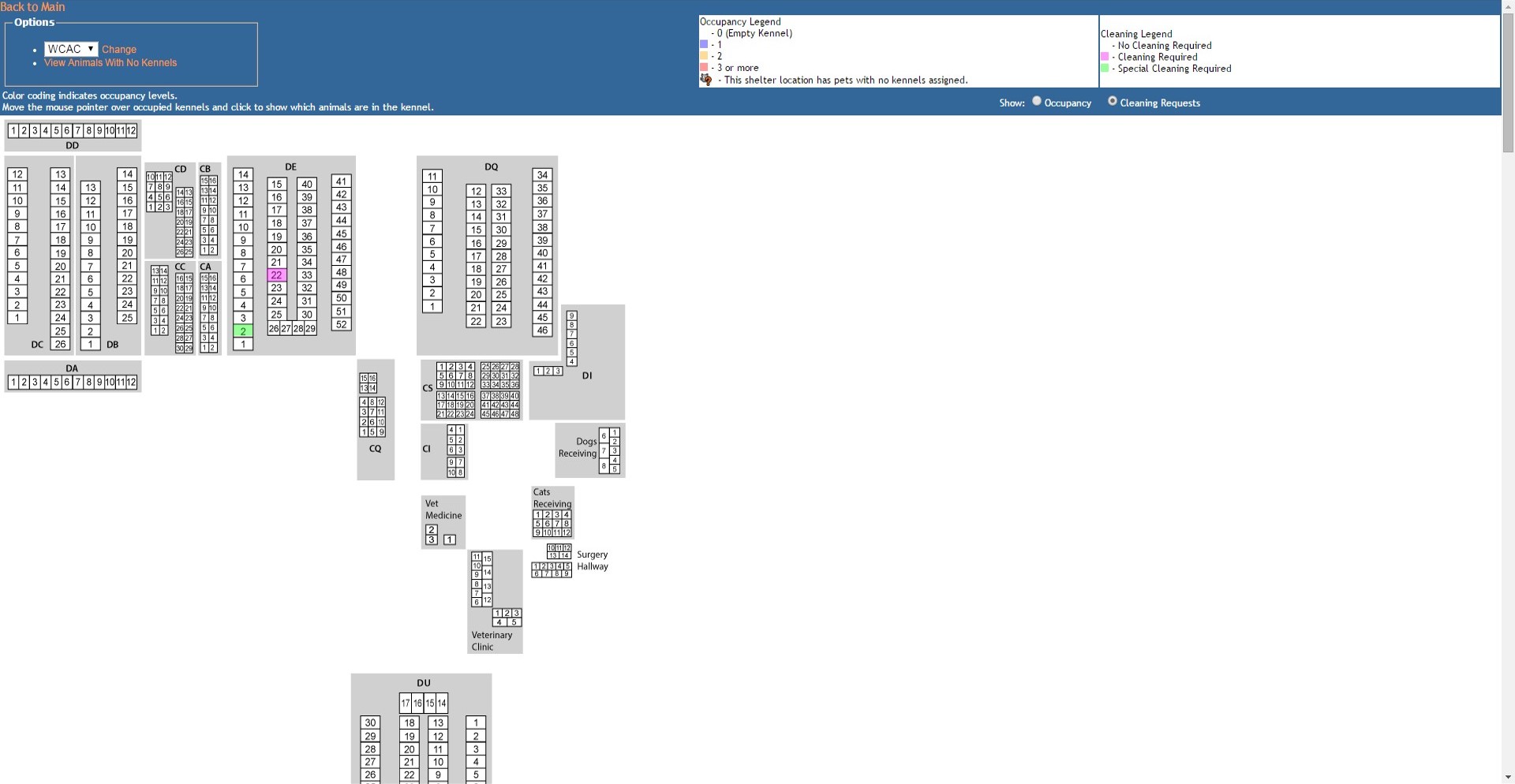 Changes to animal locations or cleaning requests cannot be made directly via the Virtual Shelter; rather it is designed as a visual indicator of occupancy or outstanding cleaning requests.