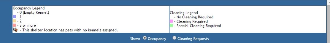 The Virtual Shelter defaults to showing occupancy, so you must first set it to show cleaning requests instead. To do this, locate the legends on the right-hand side of the screen and underneath you will see two radial buttons.