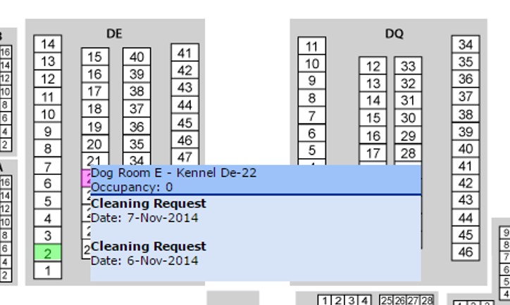 The Virtual Shelter is linked to the Kennel Cleaning Request functions and will visually display information on open cleaning requests.