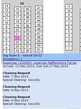 Beneath that will be the details of any occupants (if present) and each active cleaning request for that kennel.