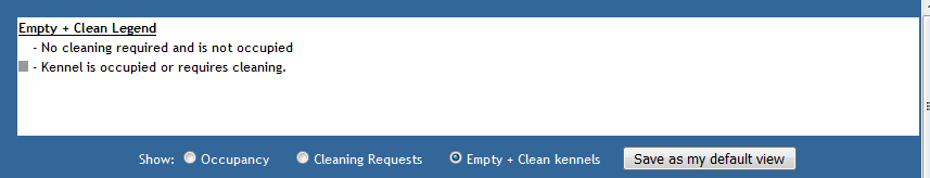 When this is selected, occupied or kennels that are empty but have not yet been cleaned will appear in grey; while empty and clean kennels ready for a new occupant will appear as white.